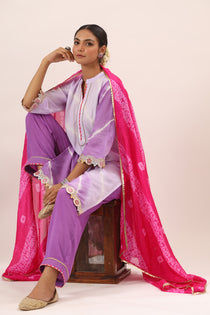 This lavender beauty features a purple hand-dyed kurta in muslin base with purple lehariya and gota lace detailing at the neck, sleeves, and hem. It is paired with matching straight pants and a pink lehariya dupatta with a lace border. Shop it here: https://www.mayori.in/collections/sets/products/lavender-blue-blooms