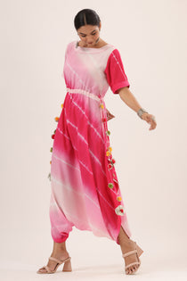 This pink lehariya jumpsuit has a lovely thread detailing at the neck and sleeves. The string in the jumpsuit is tied at the waist to shape the waist with colorful funda and gota detailing. Dhoti style lower offers the perfect balance between style and structure.