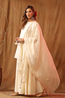 A breathing form of fine craftsmanship, get ahead with a festive ready look in this off-white Cotton Lurex kurta. The off-white cotton lurex kurta comes with a round neckline, potali button detailing, and quarter sleeves. Shop it here: https://www.mayori.in/collections/sets/products/rohini-shimmery-kurta-set-of-3