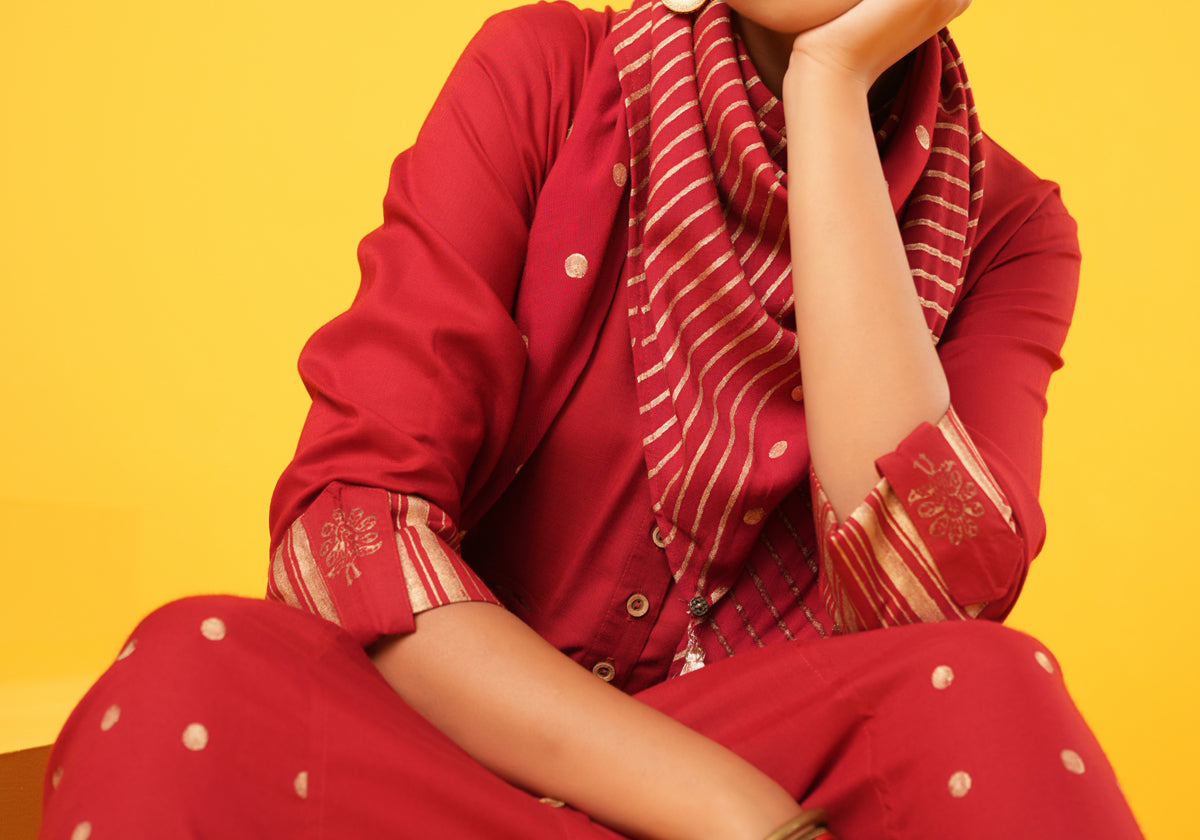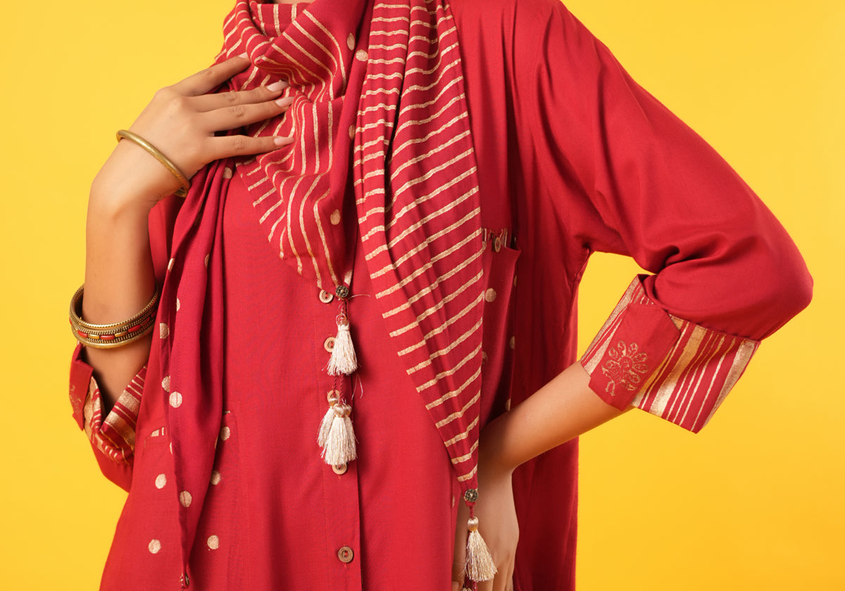 Indulge in the luxurious world of fashion with our "Elegance in Block Printed Scarves." Crafted with red rayon slub fabric with gold block print, these scarves are more than just accessories; they are expressions of style, sophistication, and individuality. The timeless design and vibrant color palette make this scarf a statement piece that effortlessly complements both casual and formal ensembles