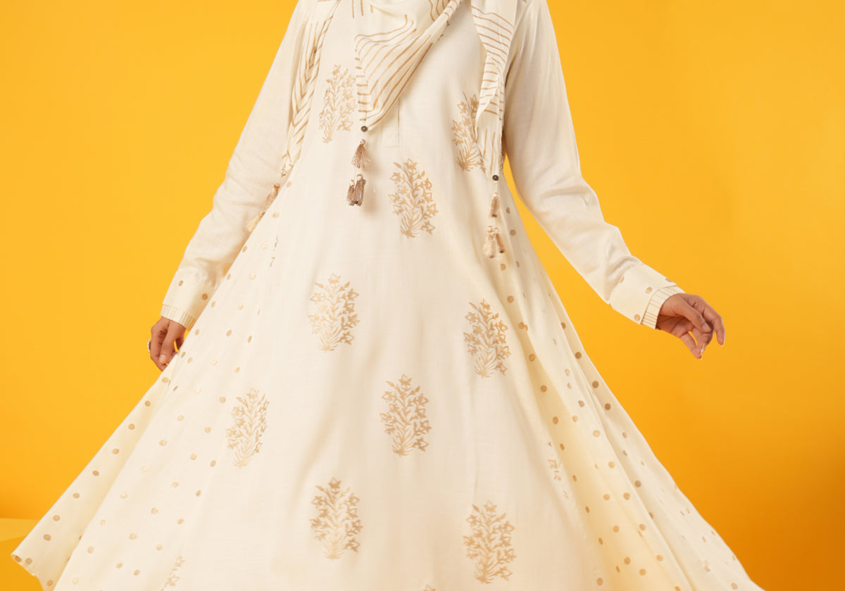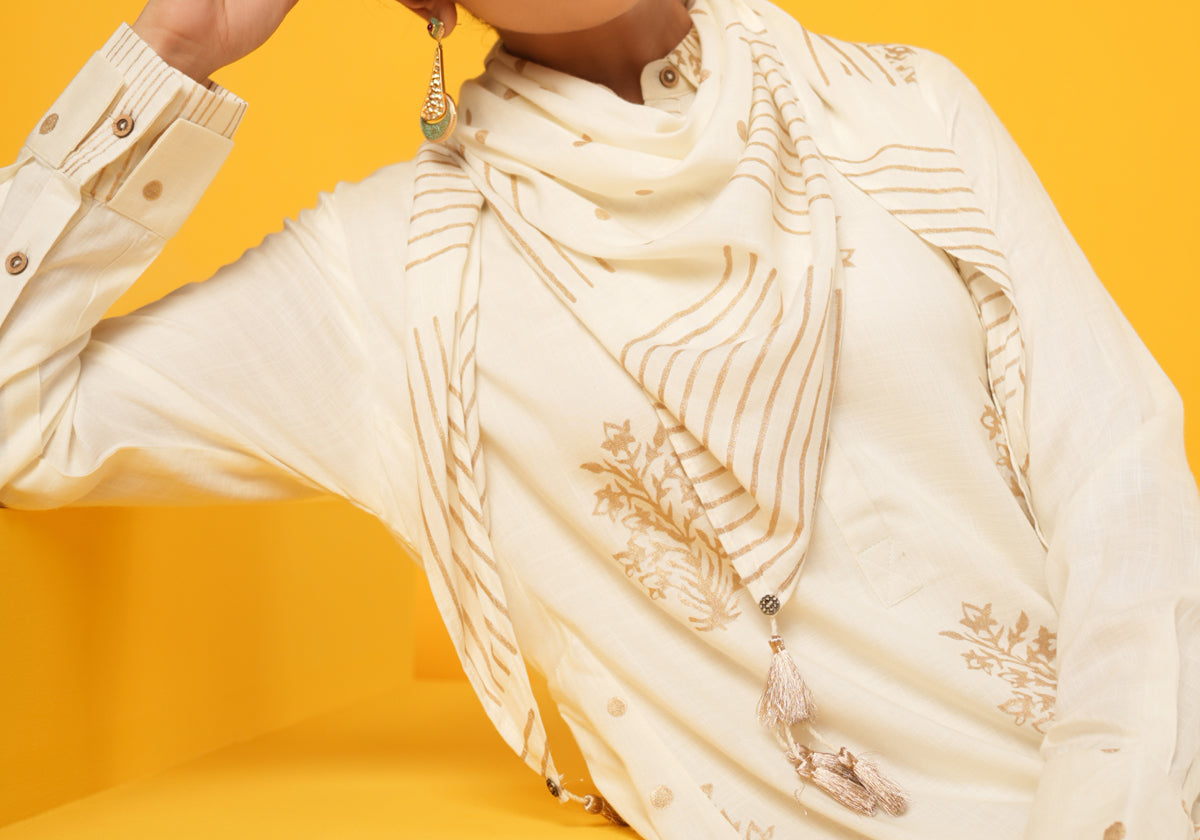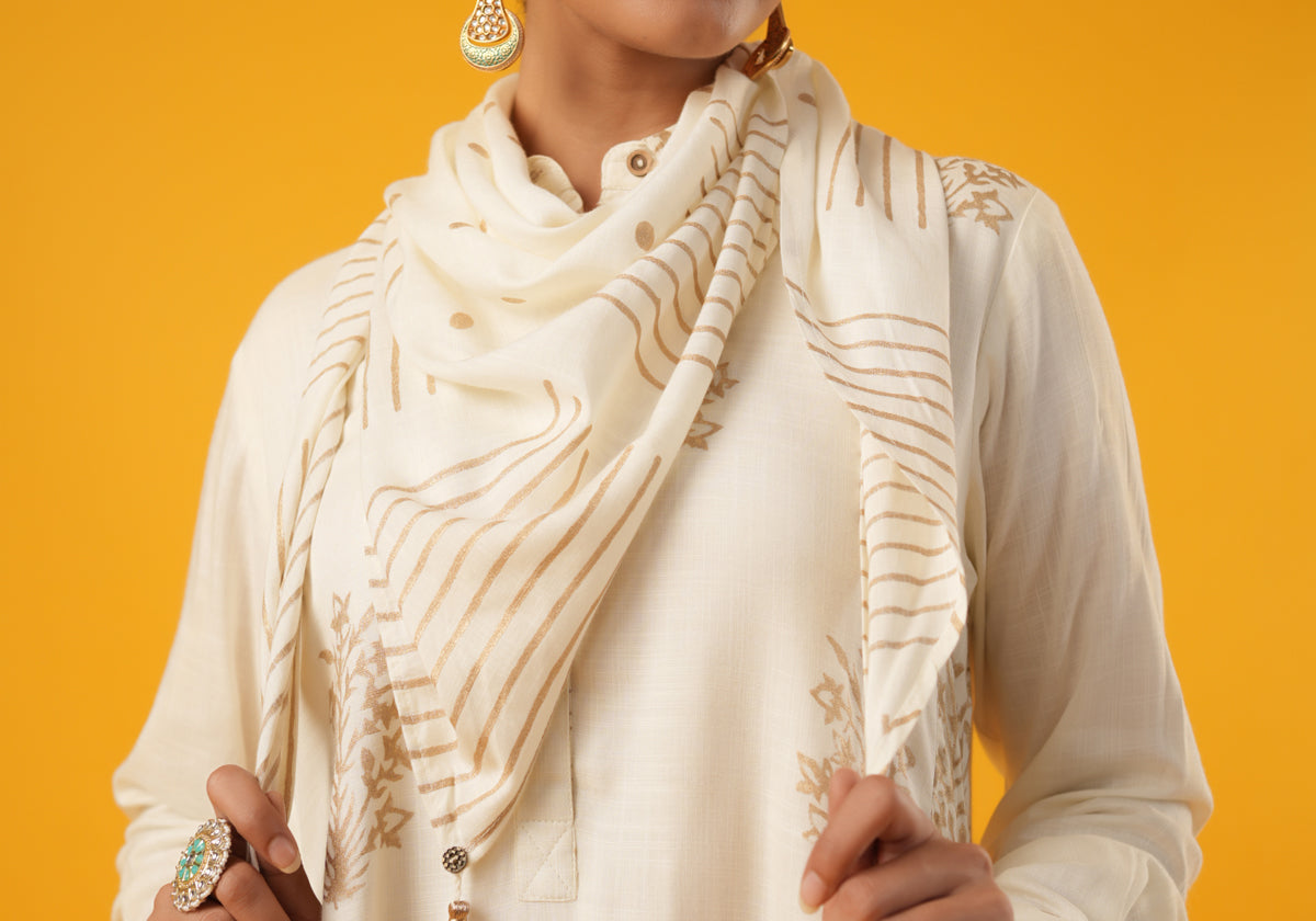 Indulge in the luxurious world of fashion with our "Elegance in Block Printed Scarves." Crafted with off white rayon slub fabric with gold block print, these scarves are more than just accessories; they are expressions of style, sophistication, and individuality. The timeless design and vibrant color palette make this scarf a statement piece that effortlessly complements both casual and formal ensembles