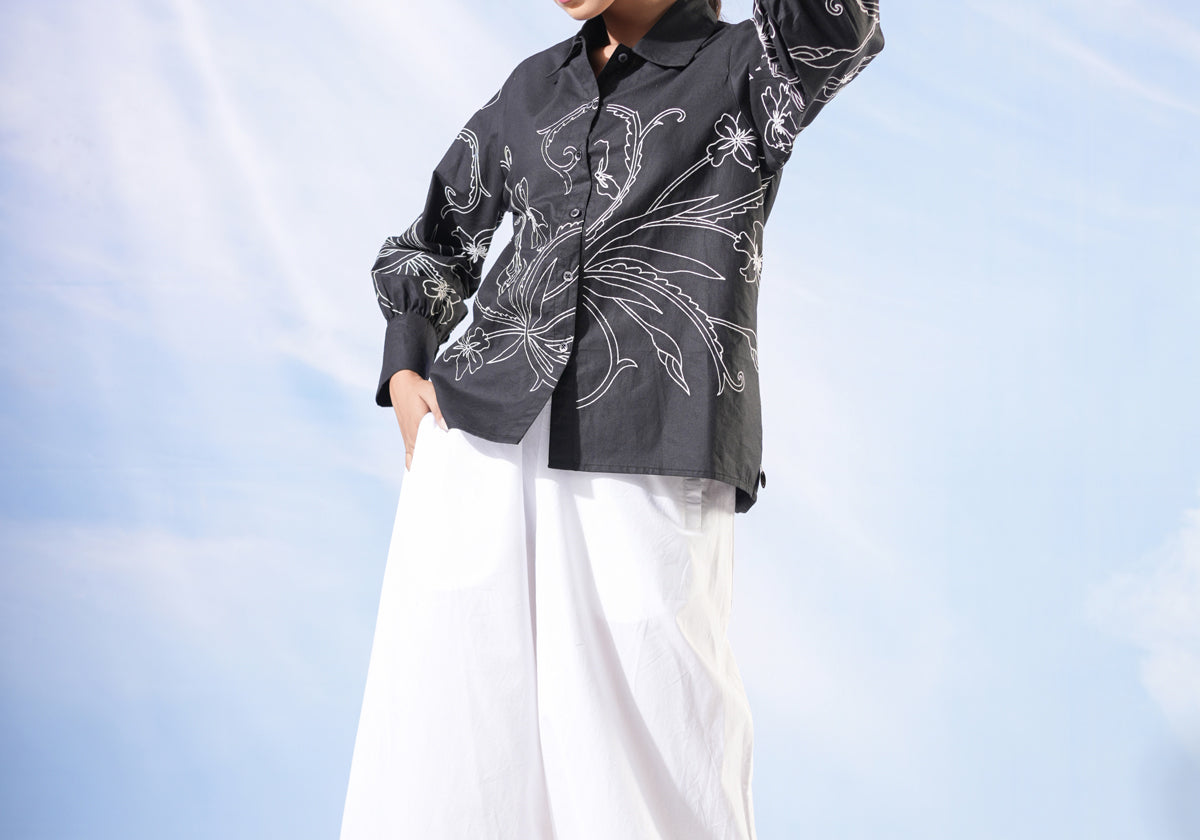 What makes this Pompon Black and White Embroidered Shirt truly unique