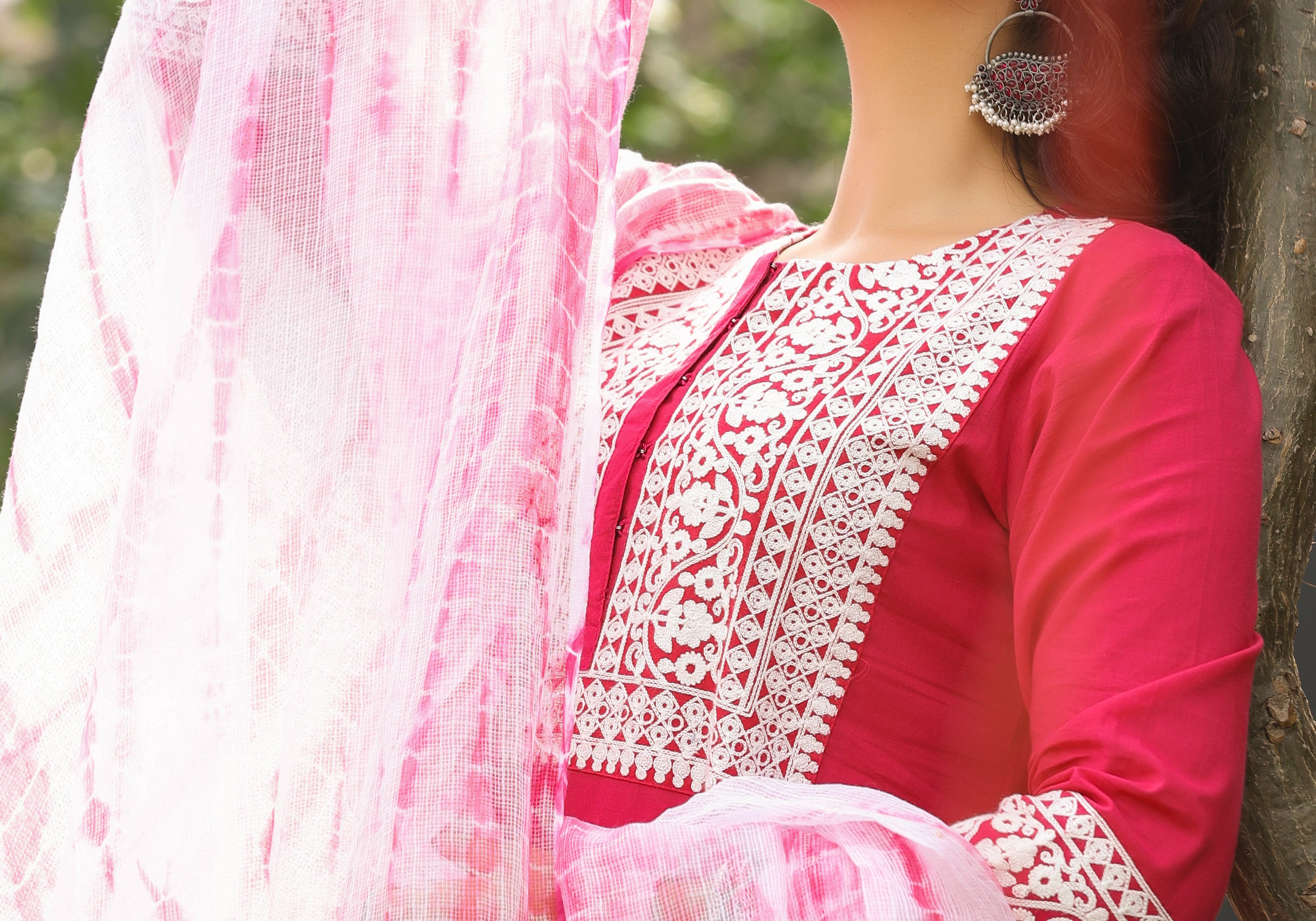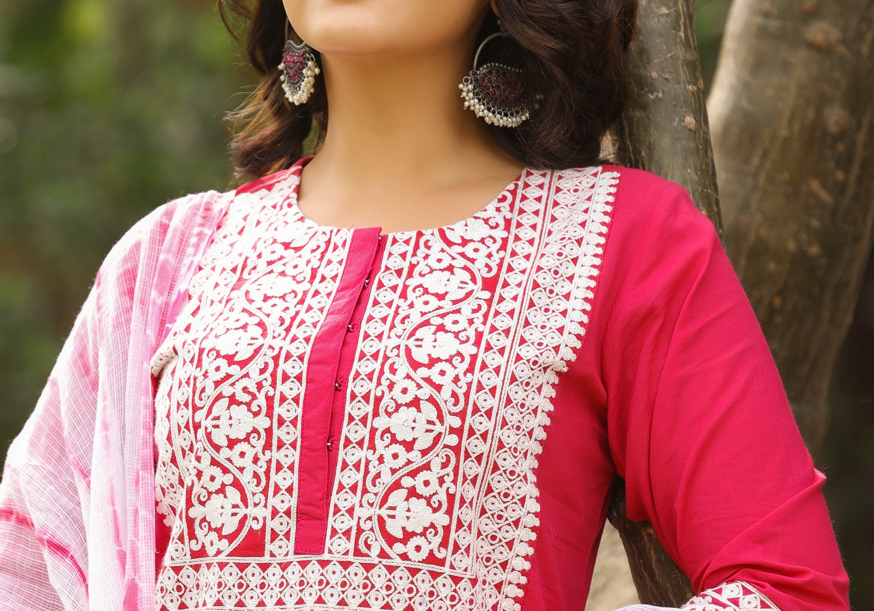 What makes this Aisha Cotton Embroidered Rani Pink Kurta Set of 3 truly unique