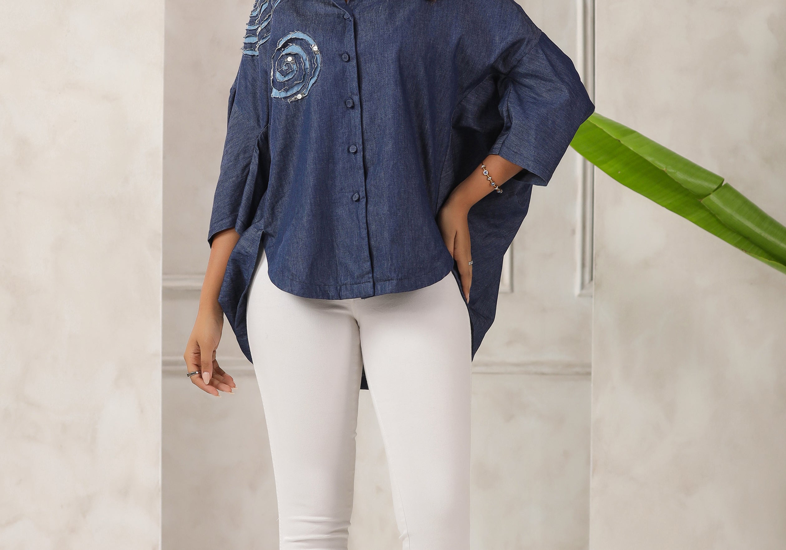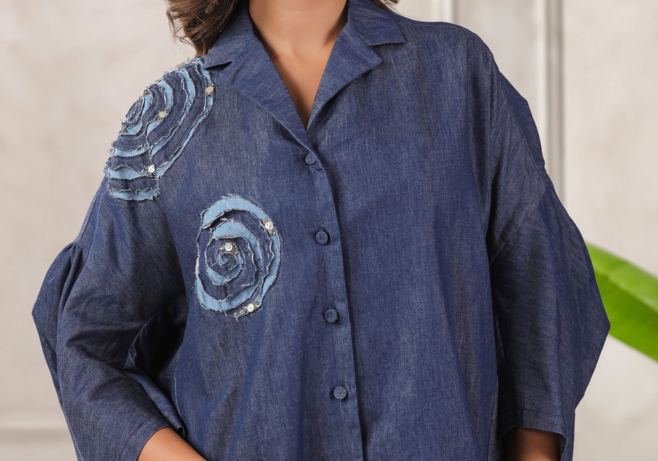 Elevate your casual wardrobe with this stunning Denim Shirt featuring delicate cutwork. Made from premium, soft denim fabric, this shirt combines classic style with modern elegance. The intricate cutwork detailing adds a feminine and artistic touch, making it perfect for day-to-night transitions.