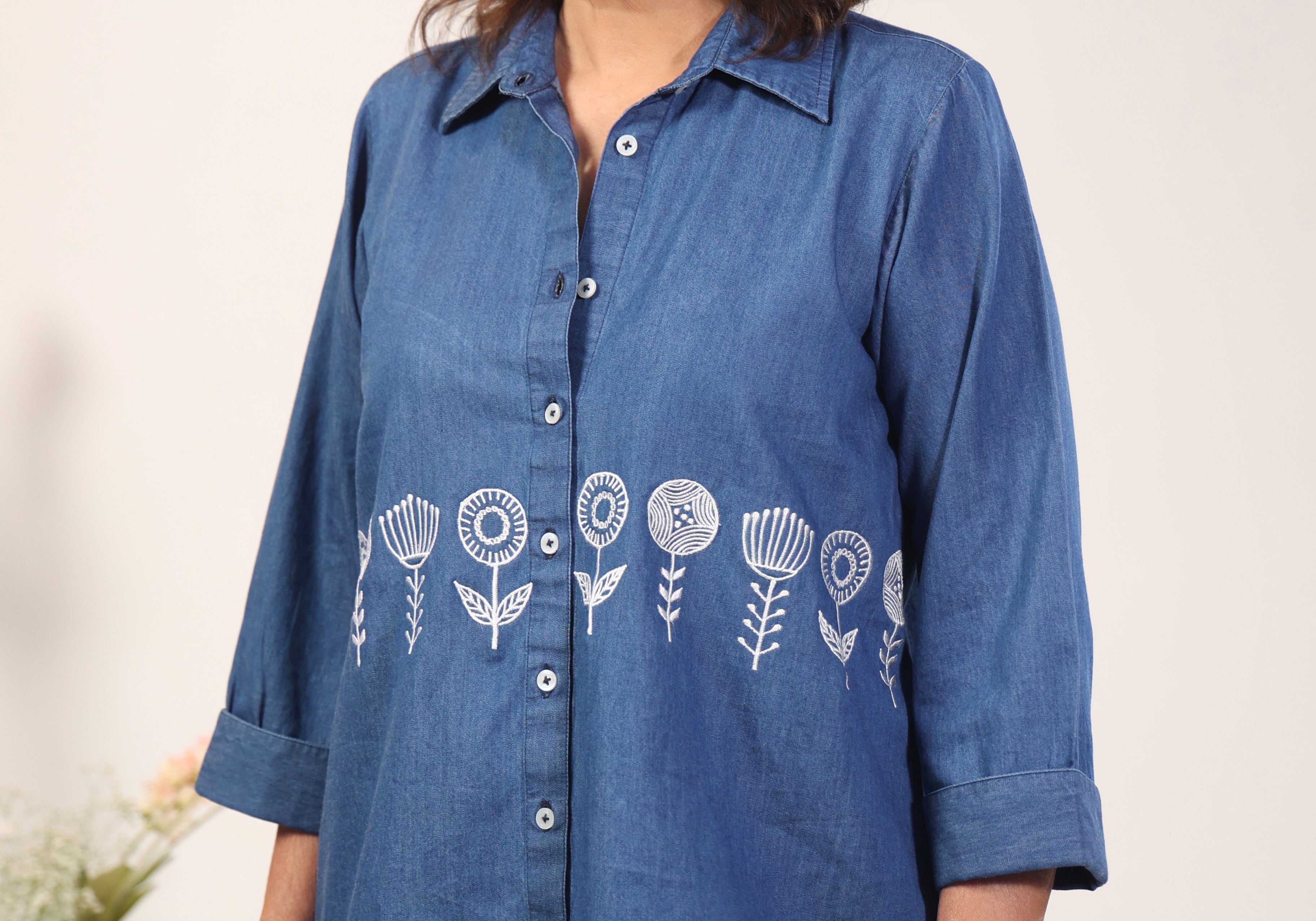 The blue denim shirt boasts a timeless design with a button-down front and a semi-shirt collar. The flower embroidery in front adds a touch of elegance and uniqueness, making it stand out from regular shirts.  Enjoy ultimate comfort and ease of movement throughout the day, Feel confident and dashing every time you wear it.