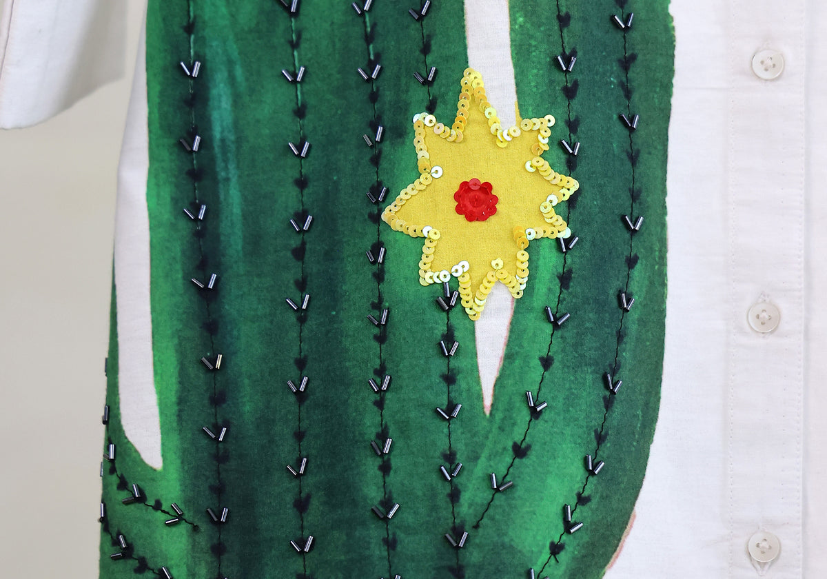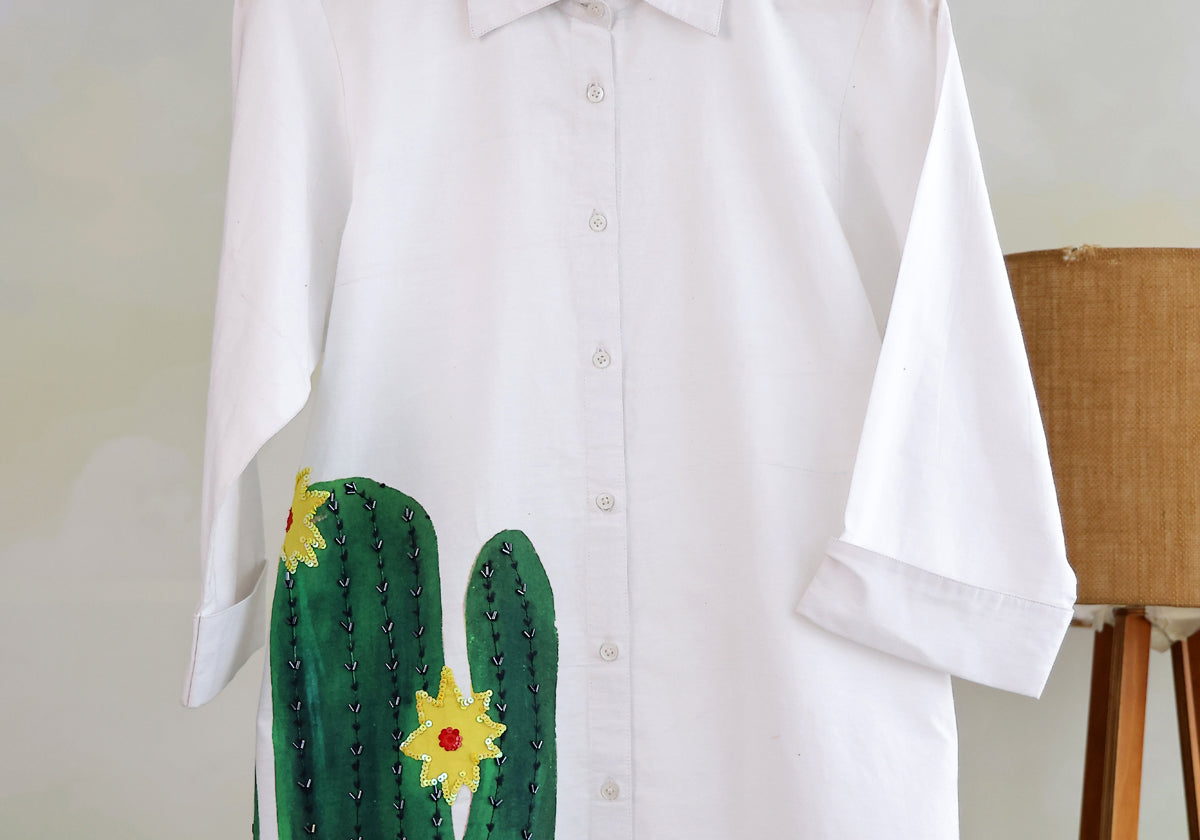 Elevate your wardrobe with this cactus Motif Digital Printed Poplin Shirt, a perfect blend of style and comfort. Crafted from premium-quality poplin fabric, this shirt offers a soft yet structured feel, ensuring breathability and durability. The cactus motif poplin shirt with handwork detailing adds a touch of artistic charm, making it a standout piece for casual outings, work wear, or weekend brunches. Designed with a classic collar, button-down front and Full sleeves, this free size shirt effortlessly combines elegance with a modern edge.