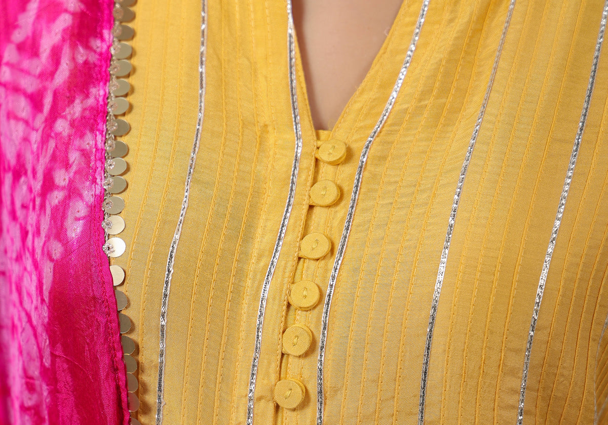 What makes this Manohari Haldi kurta set of 3 with Rani Pink Dupatta truly unique