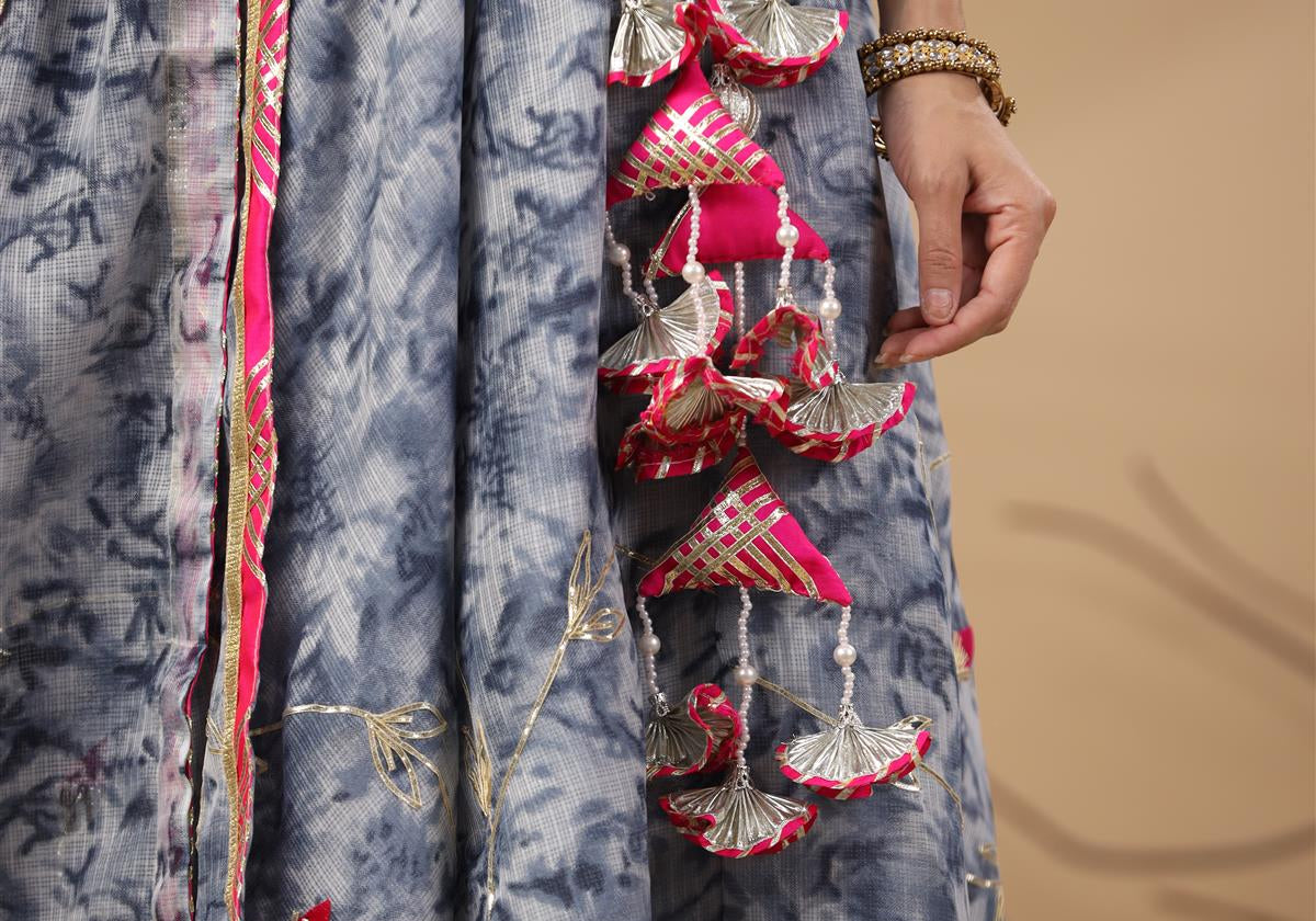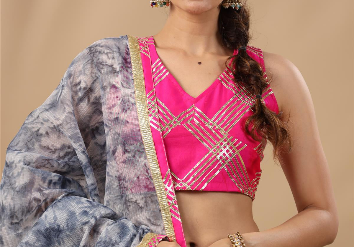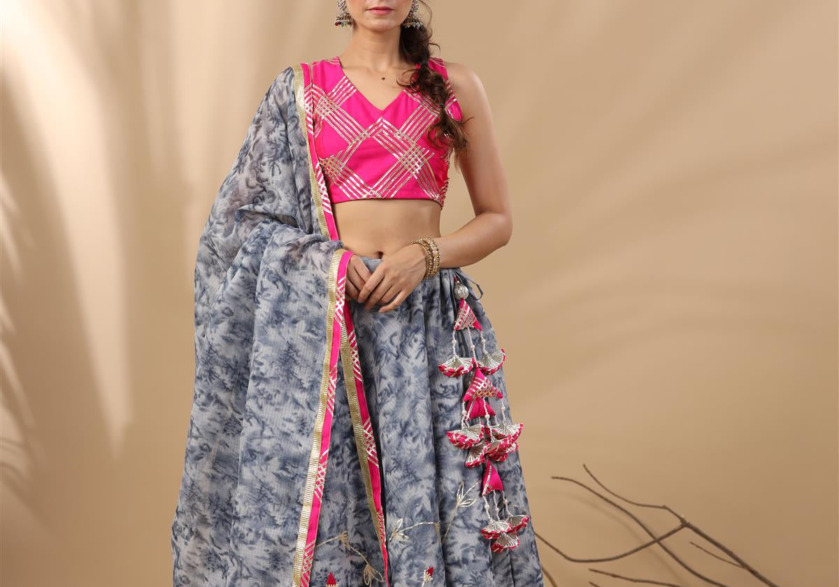 The contrast lehenga set with pink blouse & grey lehenga set is ideal for minimal weddings. Silver gota detailing leheriya lehenga  is a traditional Indian ethnic outfit known as a "lehenga choli," which is popularly worn at weddings, festivals, and other special occasions. This ready teal blue lehnga comes with pink unstitch (1mtr) fabric for blouse and matching dupatta.