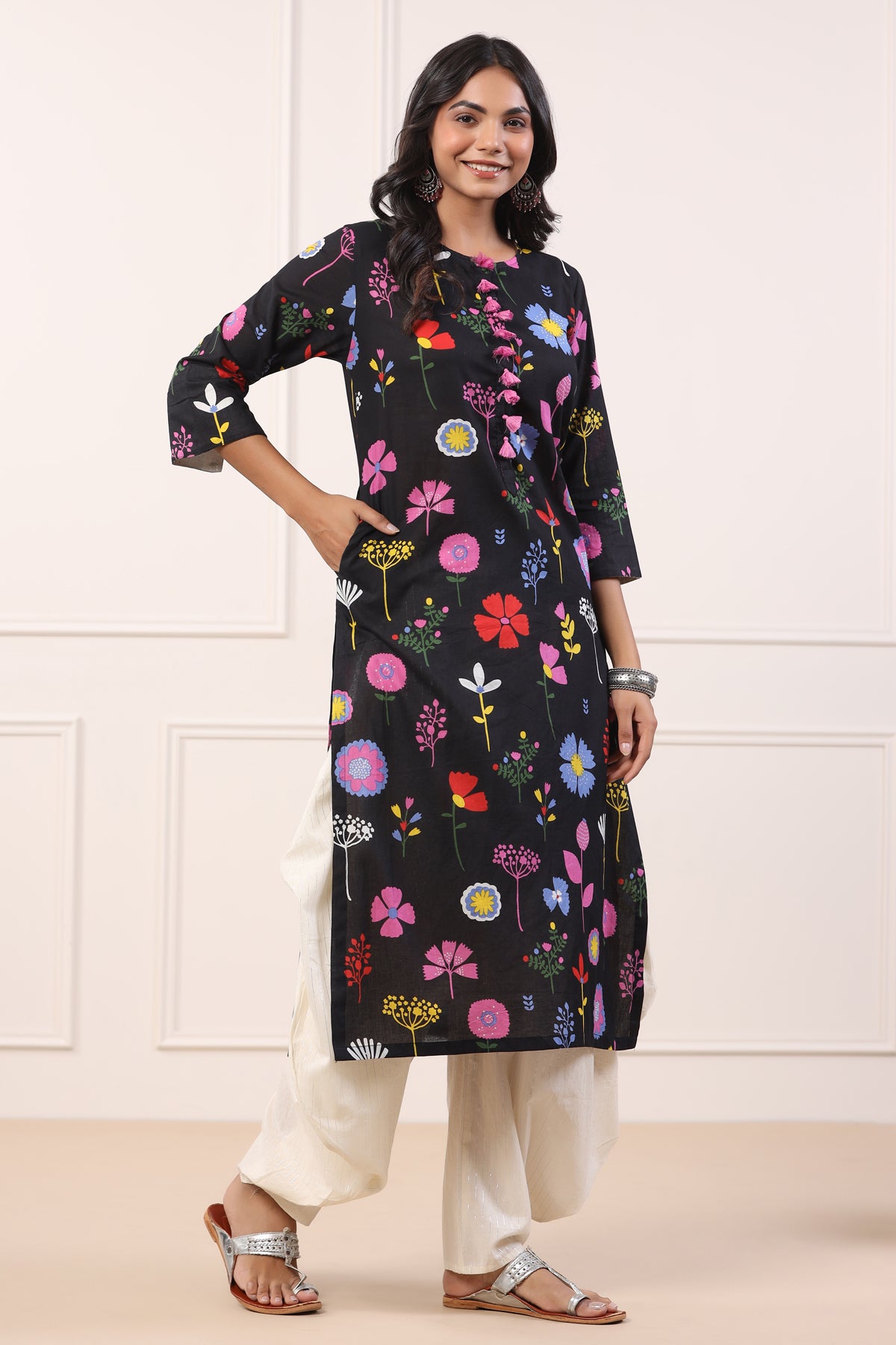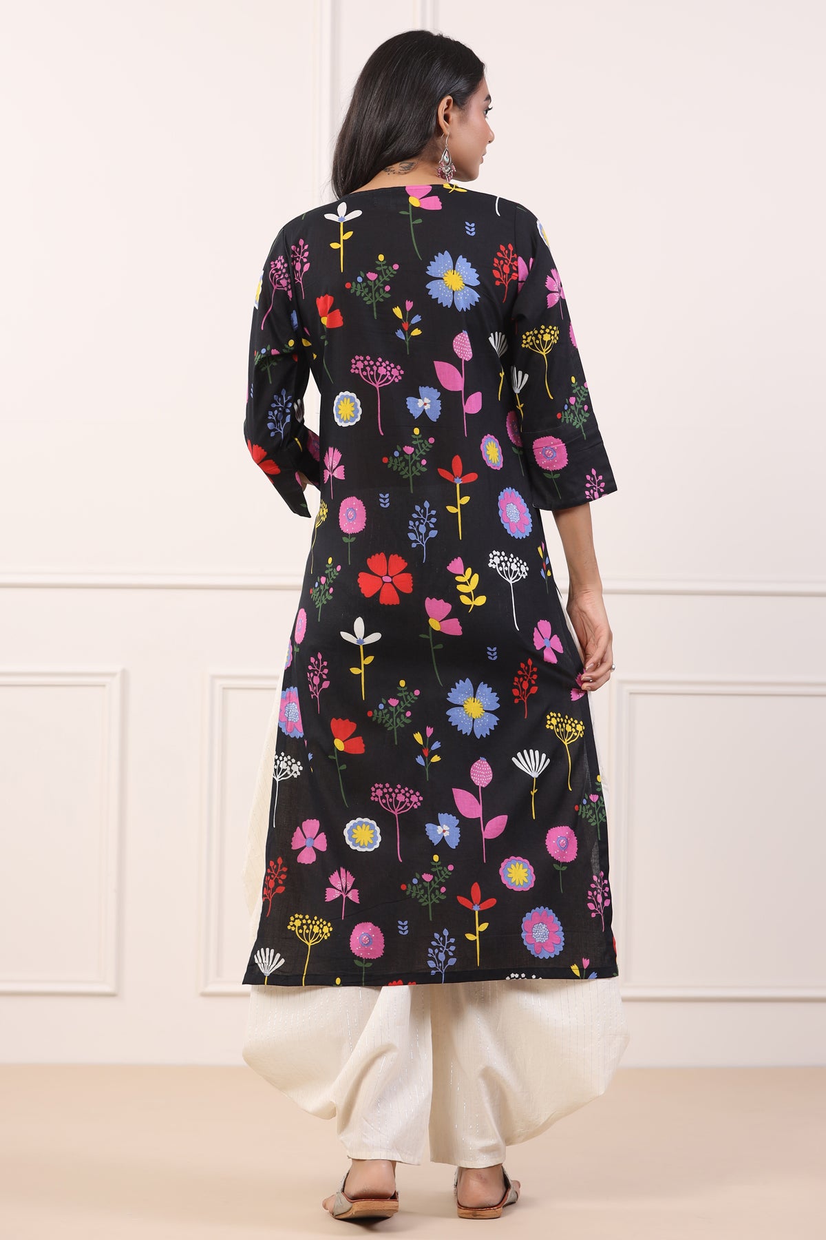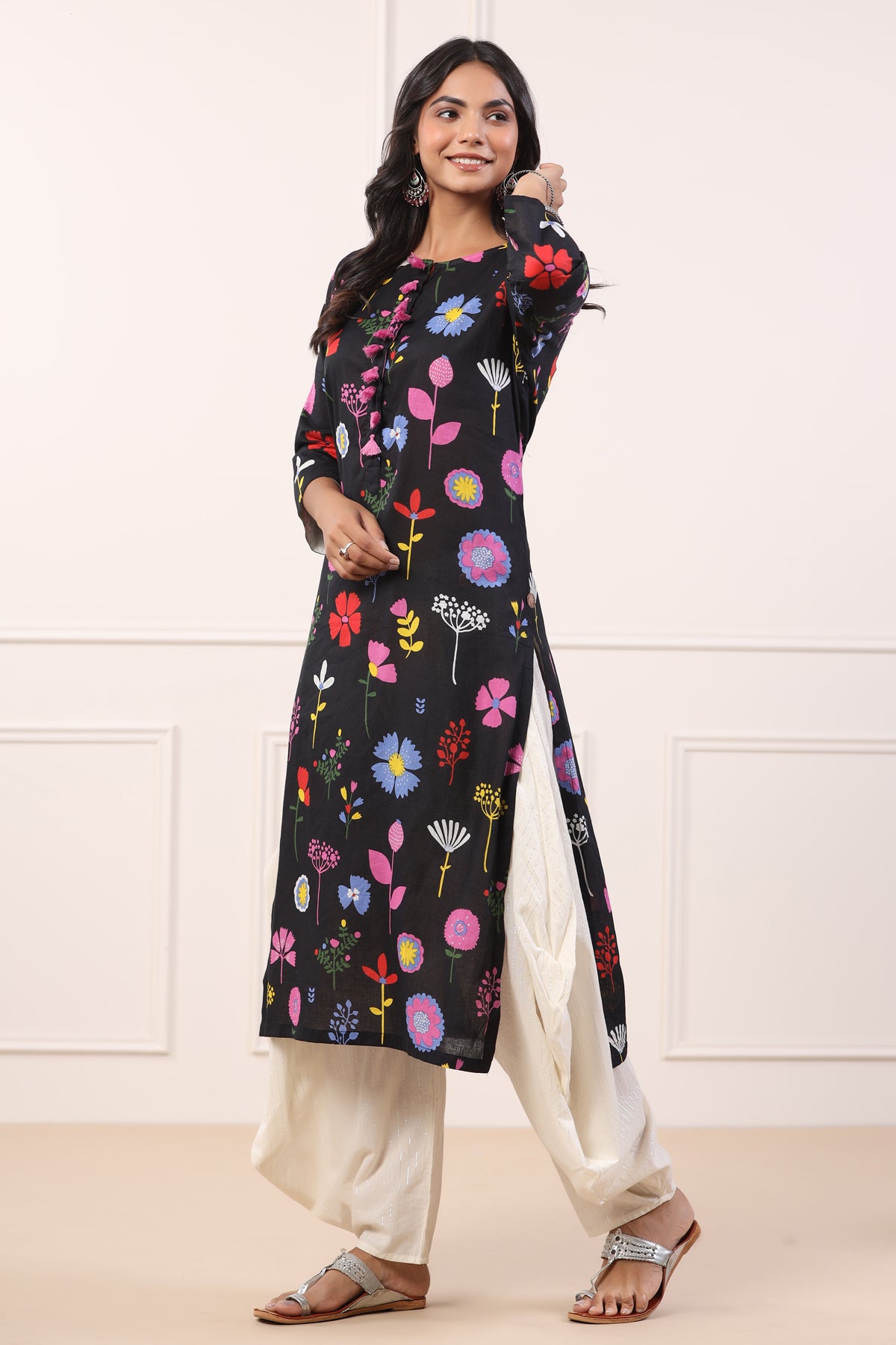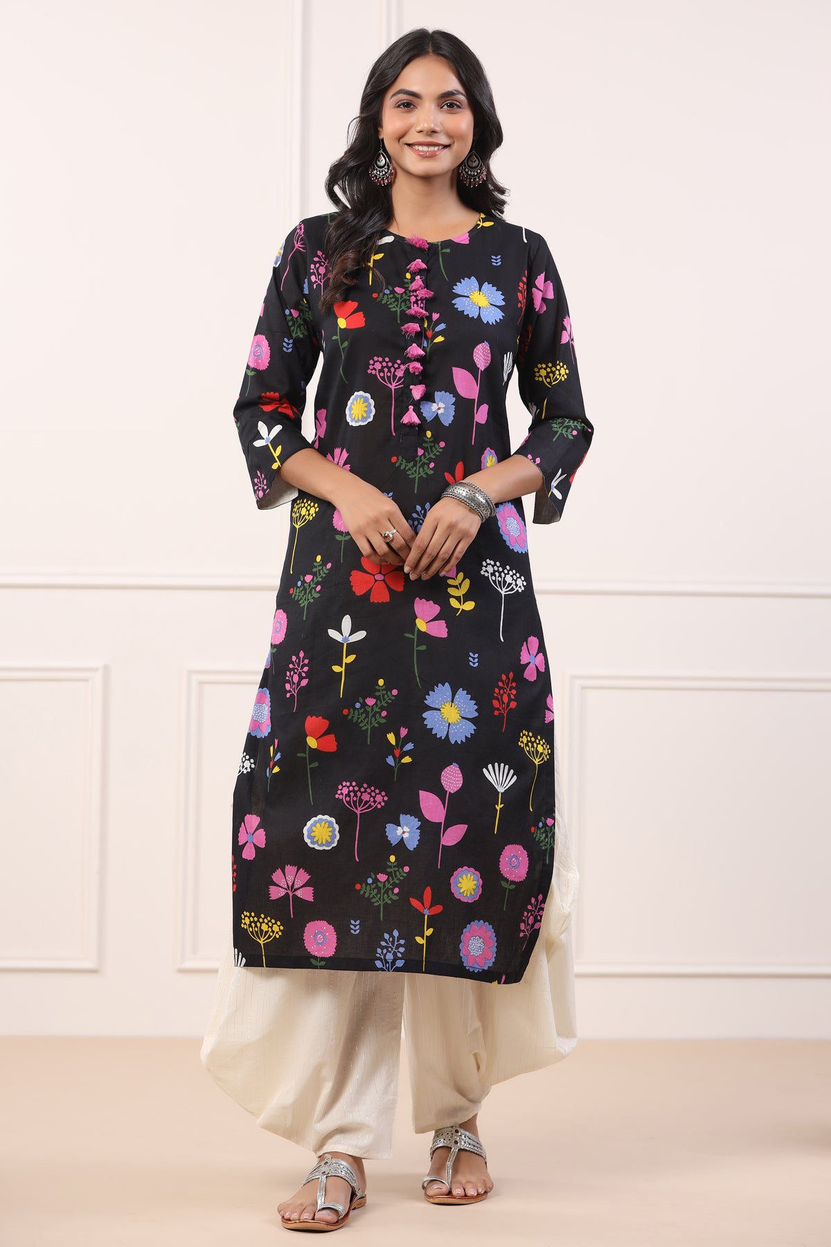 What makes this Mayori Black Floral Straight Cotton Kurta truly unique