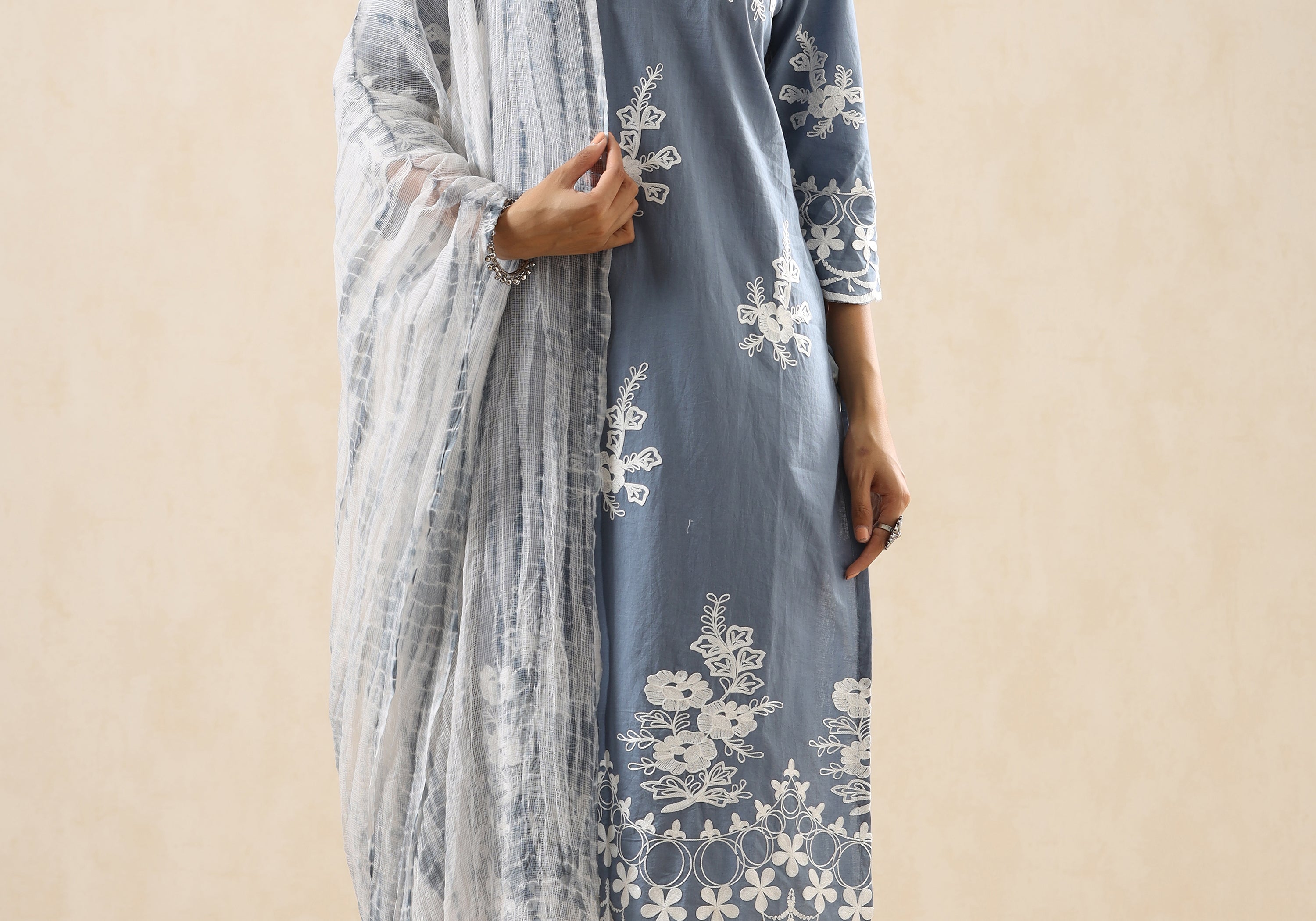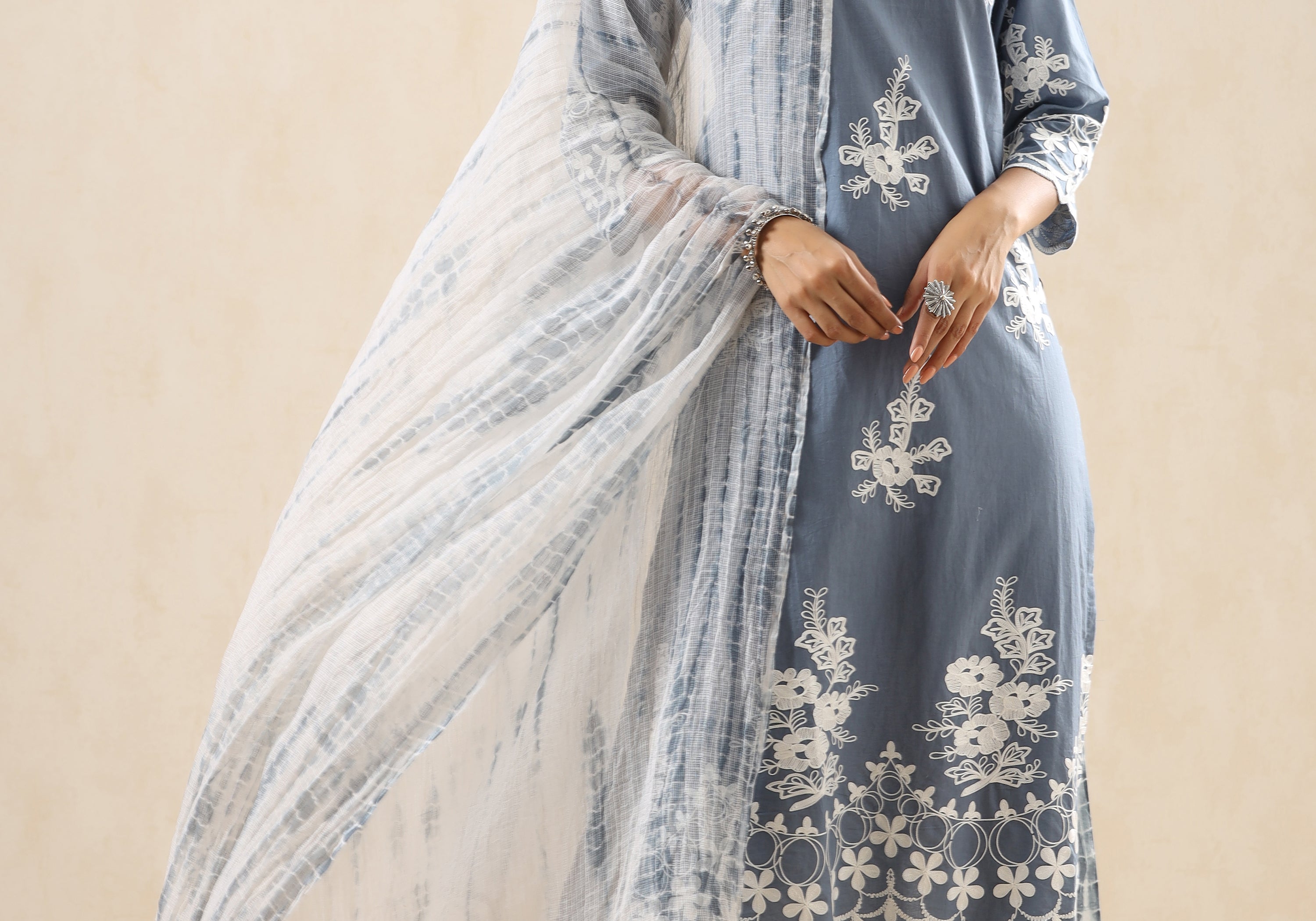 Look glorious in this light blue colored kurta set. Notch neckline with motifs through the length of the kurta leading up to the grand embroidery finished with scalloped hems. Perfect to make a subtle statement for the upcoming festivities while remaining comfortable in cotton fabric. Three-Fourth sleeves embroidery on cuffs. The set is completed with the shibori tie-dyed bottom pants with pearl detailing on borders and a matching dupatta in the same shade with fundas joined with white motis. Pair it with comfortable flats.