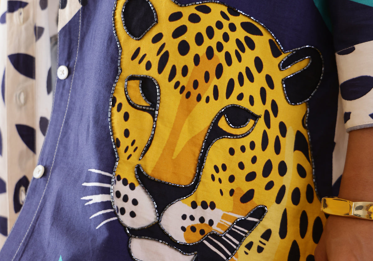 A stylish, digitally printed design featuring adorable Tiger illustrations for a fun and trendy look with cut stone hand work.