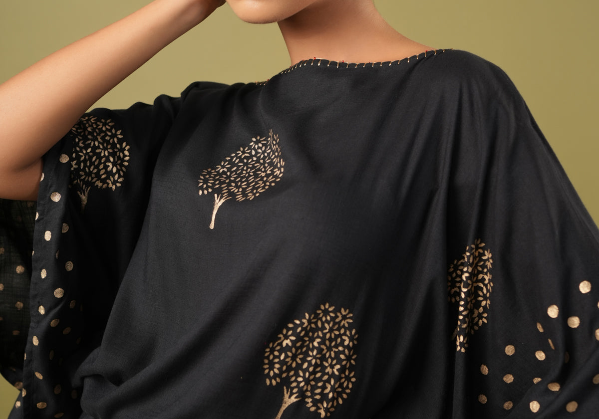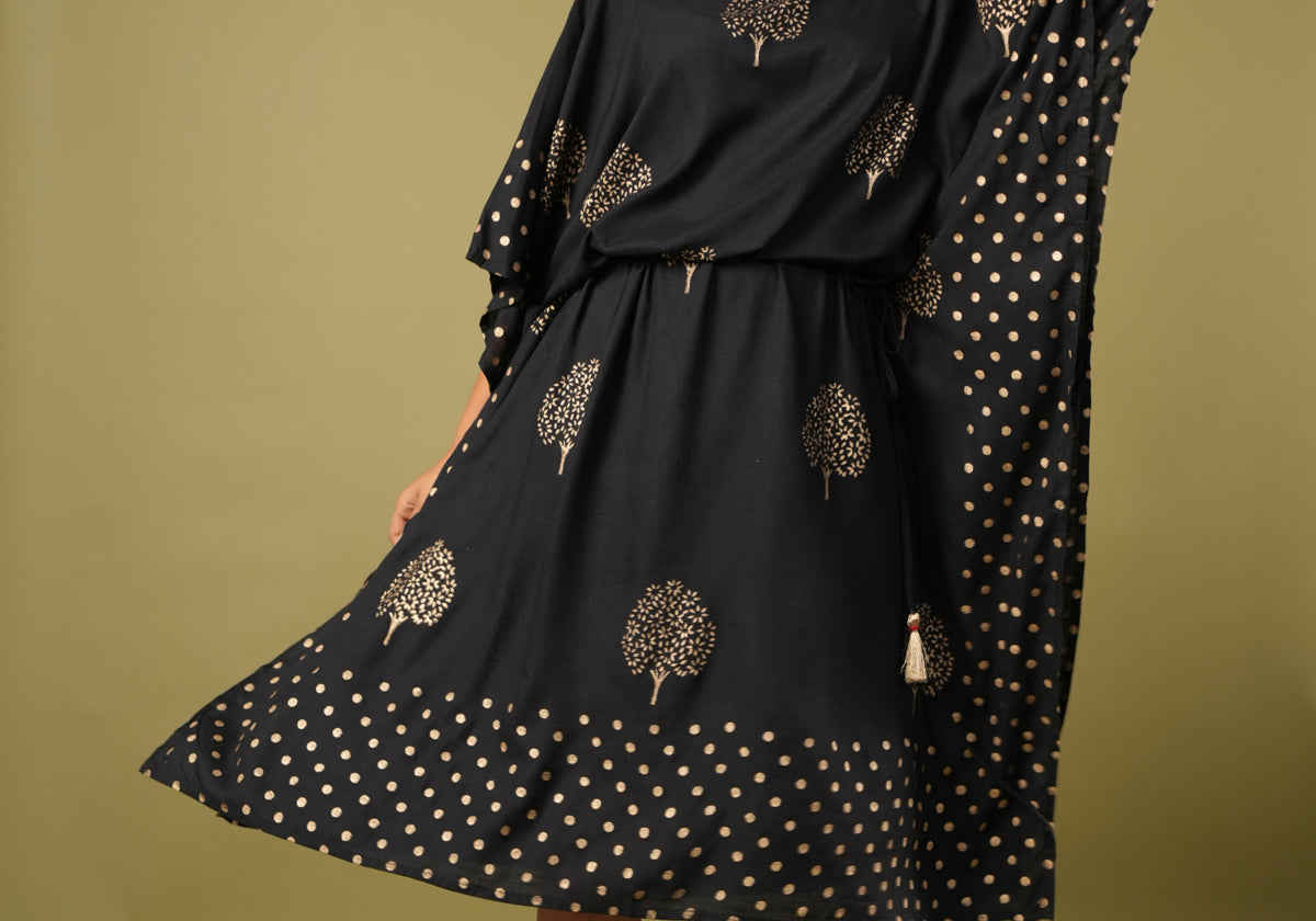 Crafted from rayon slub fabric, this knee-length kaftan dress features a delicate golden polka dotes and tree motif, meticulously printed using a traditional woodblock technique. The soft, breathable fabric makes it perfect for warm weather, while the timeless design seamlessly transitions from day to evening wear.